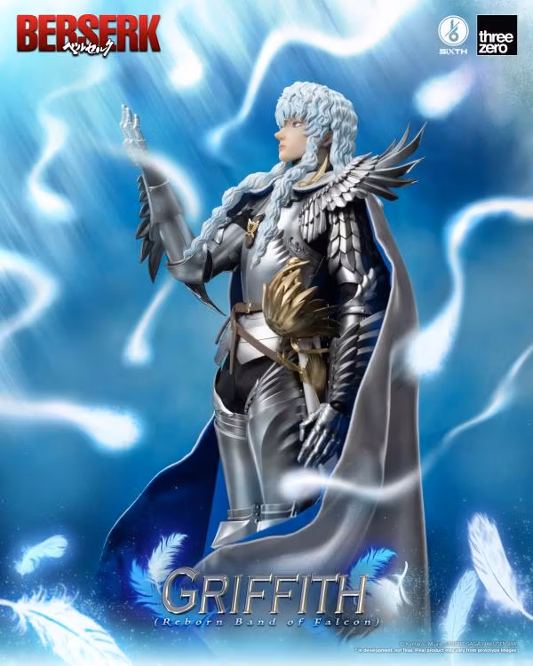 threezero presents Griffith (Reborn Band of Falcon) as an articulated 1/6th scale figure (approx. 30 cm). The figure uses a custom body with over 40 movable joints and is made of ABS, PVC and POM. Costume parts use fabric to hide the joints of the armor, while threezero's well-known paintwork highlights the details — including the metallic surfaces of the armor.