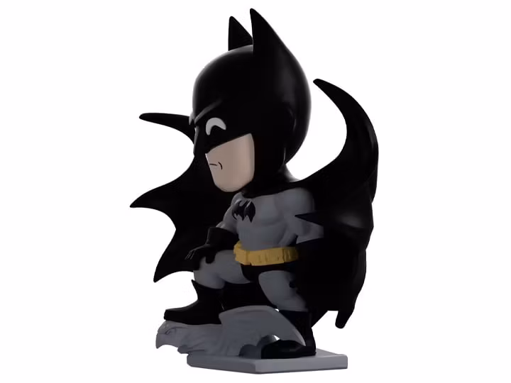 The night is dark and the signal in the sky means only one thing — Batman has arrived in Youtooz! The figure stands 5.4 inches tall with his foot placed on a stone gargoyle and one hand resting on his knee. His tight gray suit shows off his muscles and is adorned with a black bat symbol on his chest. A sharp, determined mouth is visible under the open hood that leads up to the pointed ears, and the billowing cape ends in spiky spikes. He wears a yellow tool belt and black gloves and boots.