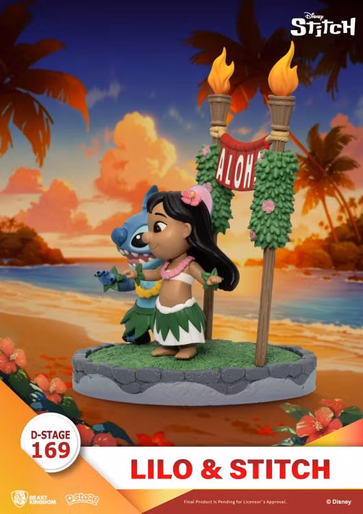 Beast Kingdom's Dream-Selected series presents a new Lilo & Stitch diorama featuring Lilo and Stitch swinging in colorful grass skirts and performing the Hawaiian hula dance.