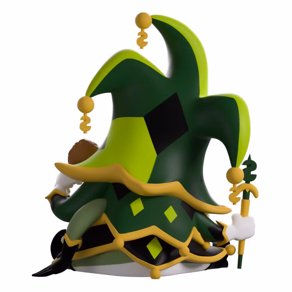 Mammon steps forward in his Youtooz debut! The figure stands approximately 4.5 inches tall and sports a sickly green toothy grin on his heart-shaped face, framed by a large three-cornered jester's hat with a gold trim and dangling dollar sign. He holds a meat bone in his raised right hand and a bucket of food near his chest, while a gold-colored scepter adorns his side. His layered green and black outfit is covered in a gold diamond pattern.