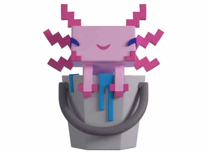 This charming Axolotl from Minecraft is a Youtooz debut worth smiling at! The figure stands approximately 3.9 inches tall and jumps out of a gray bucket filled with clear blue water. It has a wide pink smile, large fins extending from the sides of its blocky head, and a happy, playful pose.