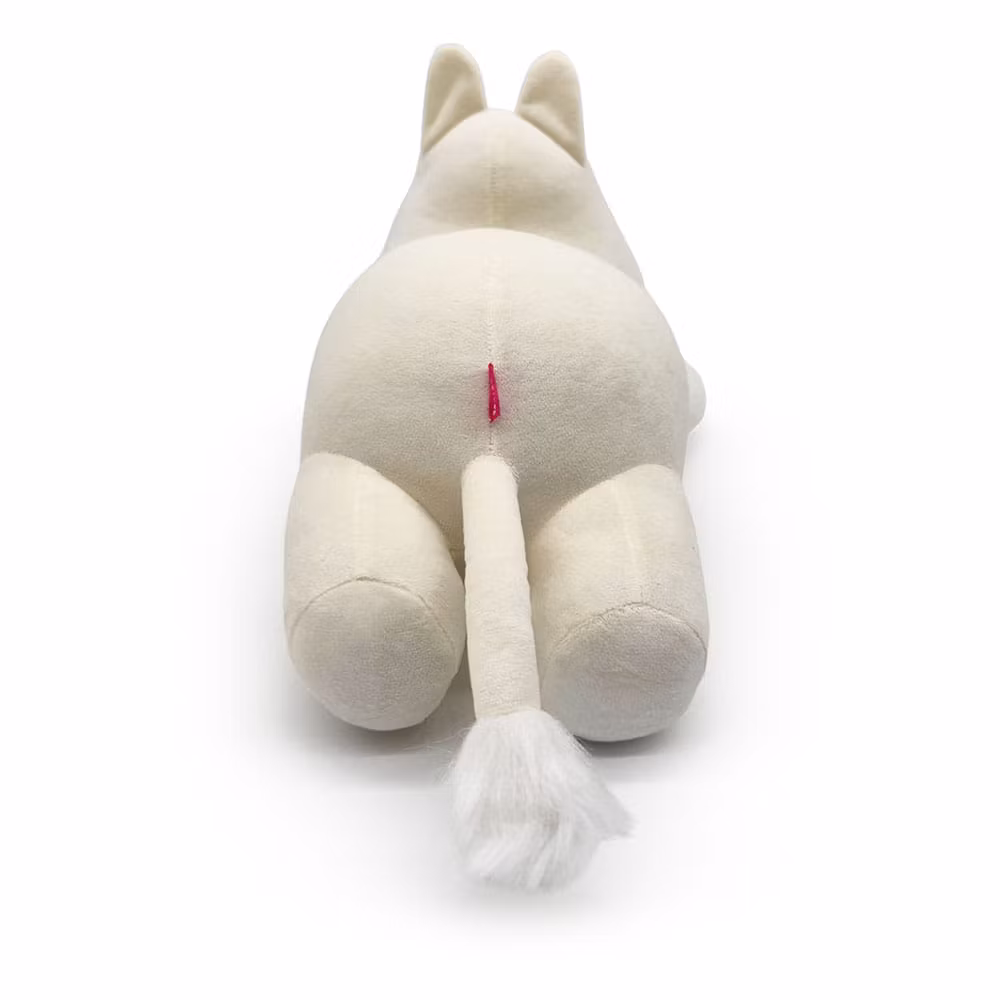 This Moomin is ready for a nap after his adventures! The plush is about 16 inches long with happy eyes, a long snout and two short round ears. Sturdy arms and legs protrude from the white body, and a thin tail with a fluffy tip lies relaxed behind. Filled with 100% PP cotton and made from a mix of minky and faux fur material — perfect for cuddling or resting with.