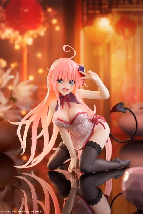 Taito's Desktop Cute Lala (Chinese Dress Ver.) from To Love-Ru Darkness stands approximately 5 inches tall. The figure depicts Lala in a pink Chinese dress as she kneels and strikes a cute pose. Don't miss the chance to add to your collection!
