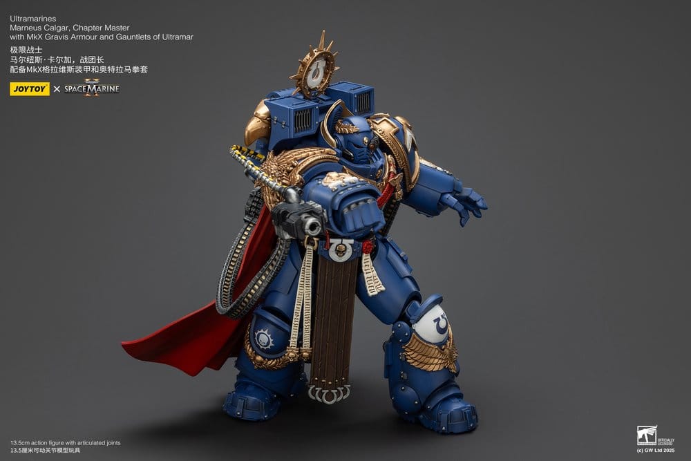 Denna detaljerade actionfigur föreställer Marneus Calgar, Chapter Master för Ultramarines i Warhammer 40,000. Figuren är rikt dekorerad med ikoniska rustningsdetaljer och vapensystem som återskapar hans mäktiga närvaro.