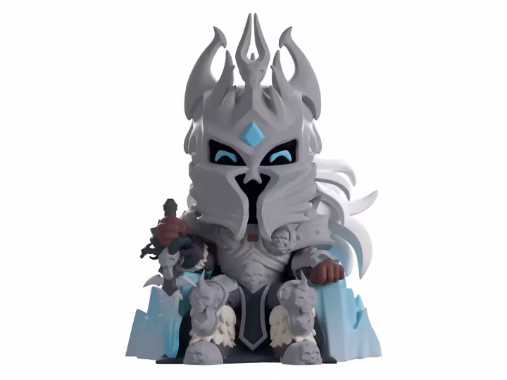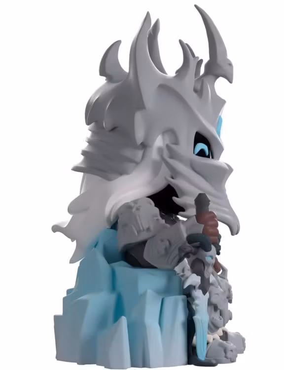 The Lich King has arrived as a vinyl collectible figure from Youtooz! He sits fiercely on his frozen throne and the figure stands approximately 5.2 inches tall. He wears his iconic gray armor, decorated with skull accents on his knees and chest. His right hand holds the hilt of his blade pointing towards the ground while his left rests nonchalantly on the throne. Long white hair flutters behind him.