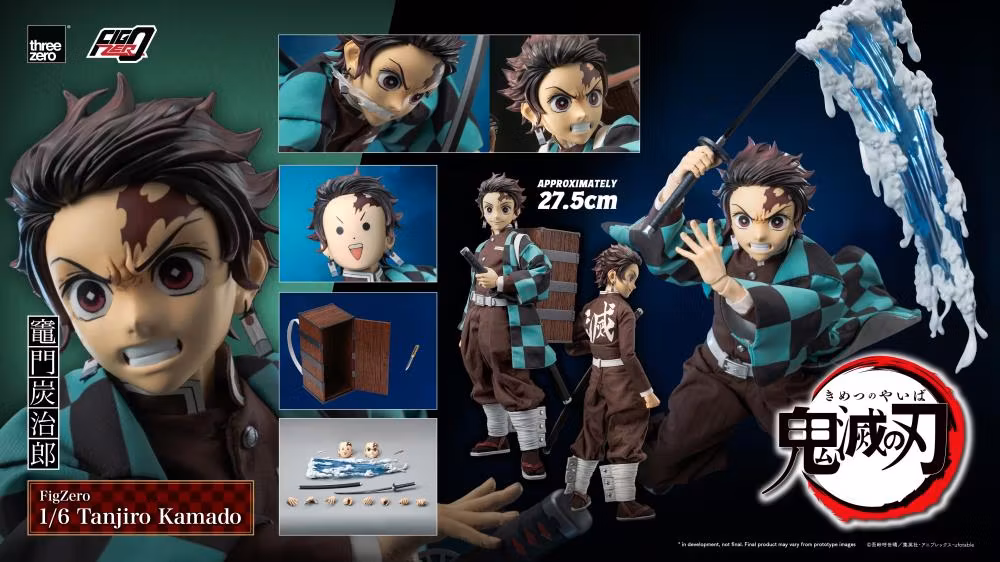threezero presenterar FigZero 1/6 Tanjiro Kamado från Demon Slayer: Kimetsu no Yaiba. Figuren är cirka 27,5 cm lång och fullt artikulerad med cirka 37 ledpunkter. Material: främst ABS, PVC, POM och tyg. Dräkten består av en tyggjord Demon Slayer Corps-uniform och en haori med inre metalltråd för formbarhet. Ingår tre utbytbara ansiktsuttryck (leende, allvarligt, gag-face), sex uppsättningar utbytbara händer samt tillbehör: ett Nichirin-svärd i metall med slida, en kniv, en öppningsbar plastträlåda, en vattenandningseffekt-del och en andningseffekt (med magnet) för att fästa vid det allvarliga ansiktet. Specifikationer: Skala 1/6, cirka 27,5 cm; cirka 37 artikulationspunkter. Dräkt: en Demon Slayer Corps-uniform i tyg, en haori i tyg, ett par benskydd, ett bälte, ett par zori och ett par tabi-strumpor. Tillbehör: tre utbytbara ansikten (inkl. ett allvarligt med magnet), sex par händer, ett metall-Nichirin-svärd med slida, en kniv, en plastträlåda, en vattenandnings-effektdel för svärdet och en magnetisk andningseffektdel.