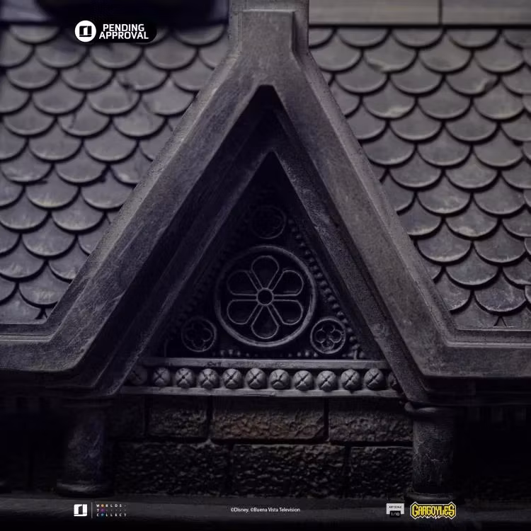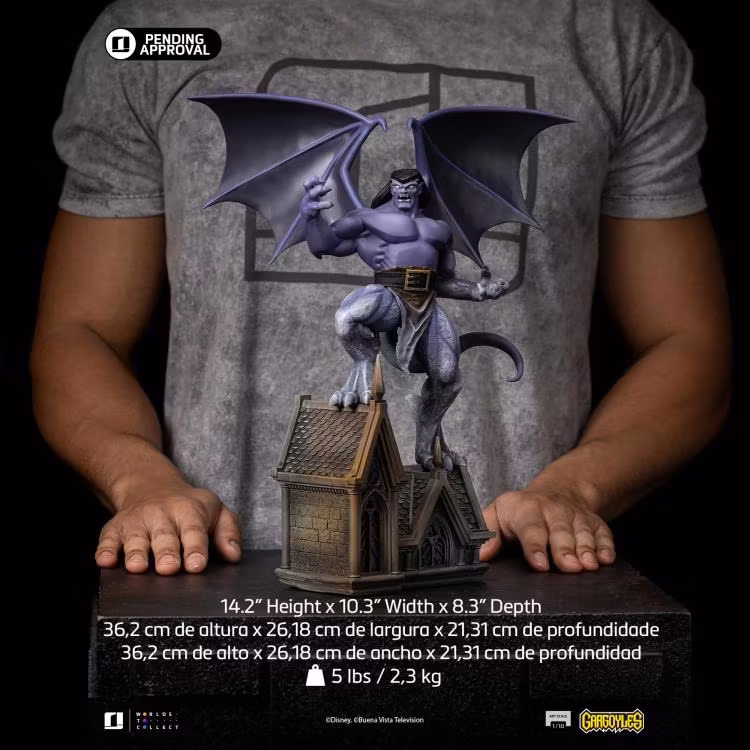 Statyn är skulpterad i skala 1/10, tillverkad av högkvalitativt harts och handmålad med omsorg. Goliath avbildas med utfällda vingar stående på ett hustak – ett perfekt tillskott för alla Gargoyles-fans.