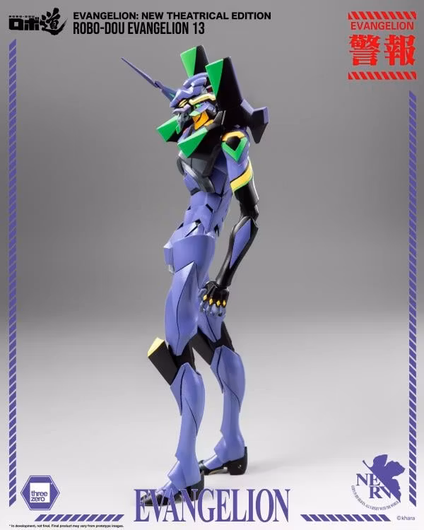 Från ”Evangelion: New Theatrical Edition” kommer threezeros ROBO-DOU-versionen av Evangelion 13! ROBO-DOU Evangelion 13 är en icke-skalig, ledad samlarfigur på cirka 28 cm (11,02″) inklusive axelpylonerna, med en pressgjuten zinklegeringsram och omkring 50 artikulationspunkter. Figuren är tillverkad i ABS, PVC, POM och zinklegering och använder threezeros färgteknik för att lyfta fram mekaniska detaljer samt ett huvud med röda ögon.