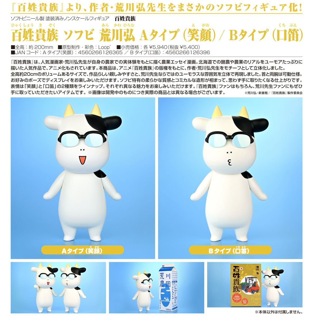En charmig soft vinyl-figur från Hyakusho Kizoku: The Farmer’s Days, inspirerad av mangaskaparen Hiromu Arakawas humoristiska stil. Denna version med leende uttryck fångar seriens lekfulla och unika karaktär på ett tilltalande sätt.Tillverkad i mjuk vinyl med noggrant skulpterade detaljer ger figuren en stilren och samlarvänlig design. Perfekt för fans av manga och samlarfigurer som söker en originell och uttrycksfull modell till sin samling.