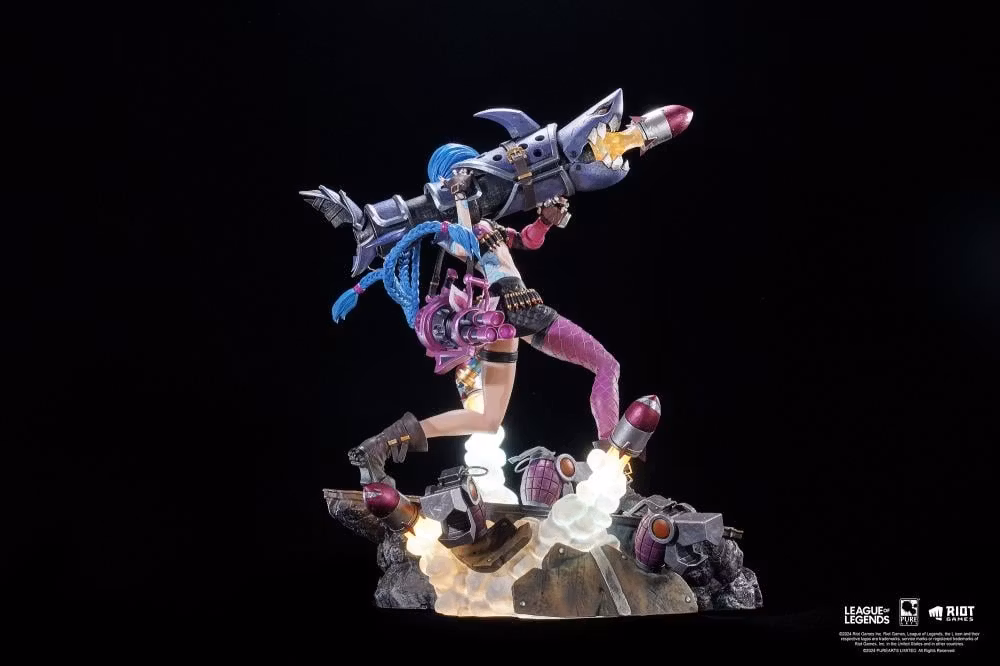 The Loose Cannon ansluter sig till PureArts League of Legends-masterserie i 1/6-skala! Jinx återges i sitt ursprungliga skin i en actionpose medan hon avfyrar sitt raketgevär Fishbones. Hennes Zapper-stötpistol och minigun Pow-Pow följer med, och LED-lampor i statyn lyfter fram detaljerna.