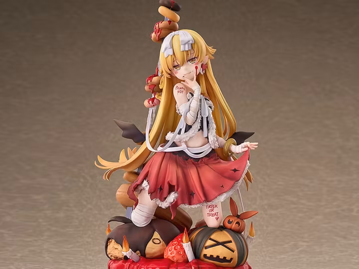 Från Monogatari-serien kommer en Halloween-inspirerad 1/7-skala av vampyrflickan Shinobu Oshino! Hon visas oskyldig men ändå sensuell i en kokett pose med fladdrande kjol och fladdermusvingar. Basen föreställer en jordgubbstårta täckt av sylt och dekorationer som ljus och munkar, vilket ger en kusligt festlig känsla.