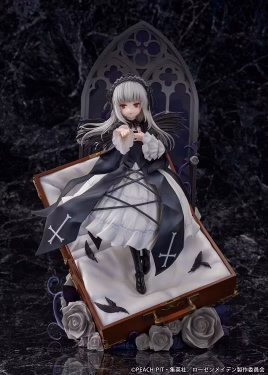 Från TV-animen Rozen Maiden kommer en figur av Suigintou! Den gotiska svarta rosjungfrun avbildas i sin mörka outfit, där vingarna är skulpterade med hög detaljgrad. En målat glas-bakgrund erbjuds som valbar display.
