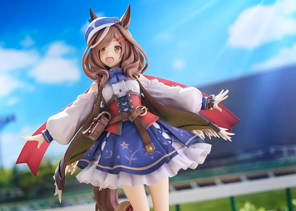 Detaljer som cutaway-blusen med bar axel, utsmyckad cape, den signaturartade kassettkepsen med öppning för örat och snörkängorna är noggrant utförda. Figuren levereras med utbytbara ”Ei, ei, mun!”-delar för att visa hennes karaktäristiska fras, och kassettlocket kan tas av för variationsrika visningar. En bedårande och flitigt arbetande Umamusume att lägga till samlingen.